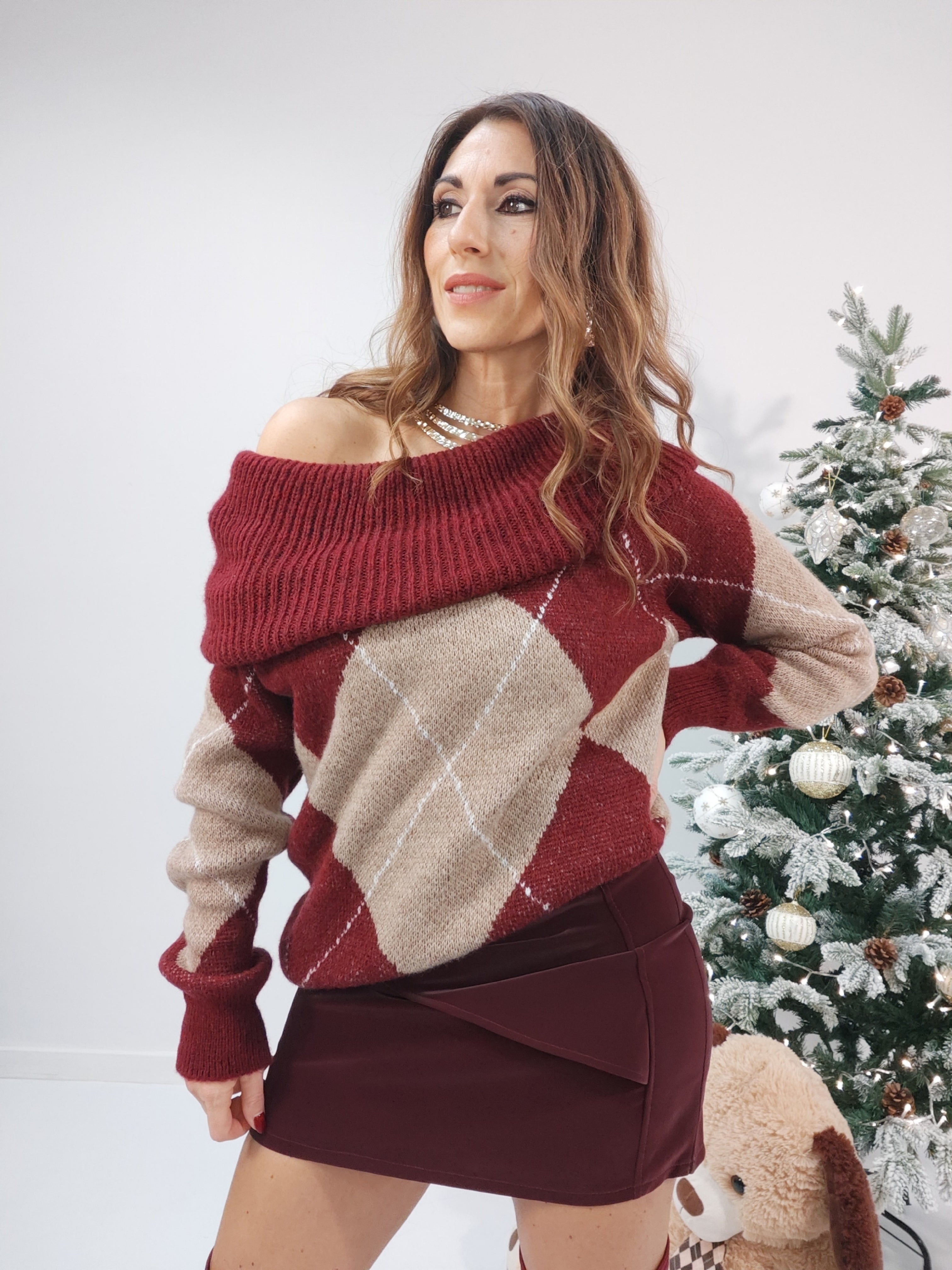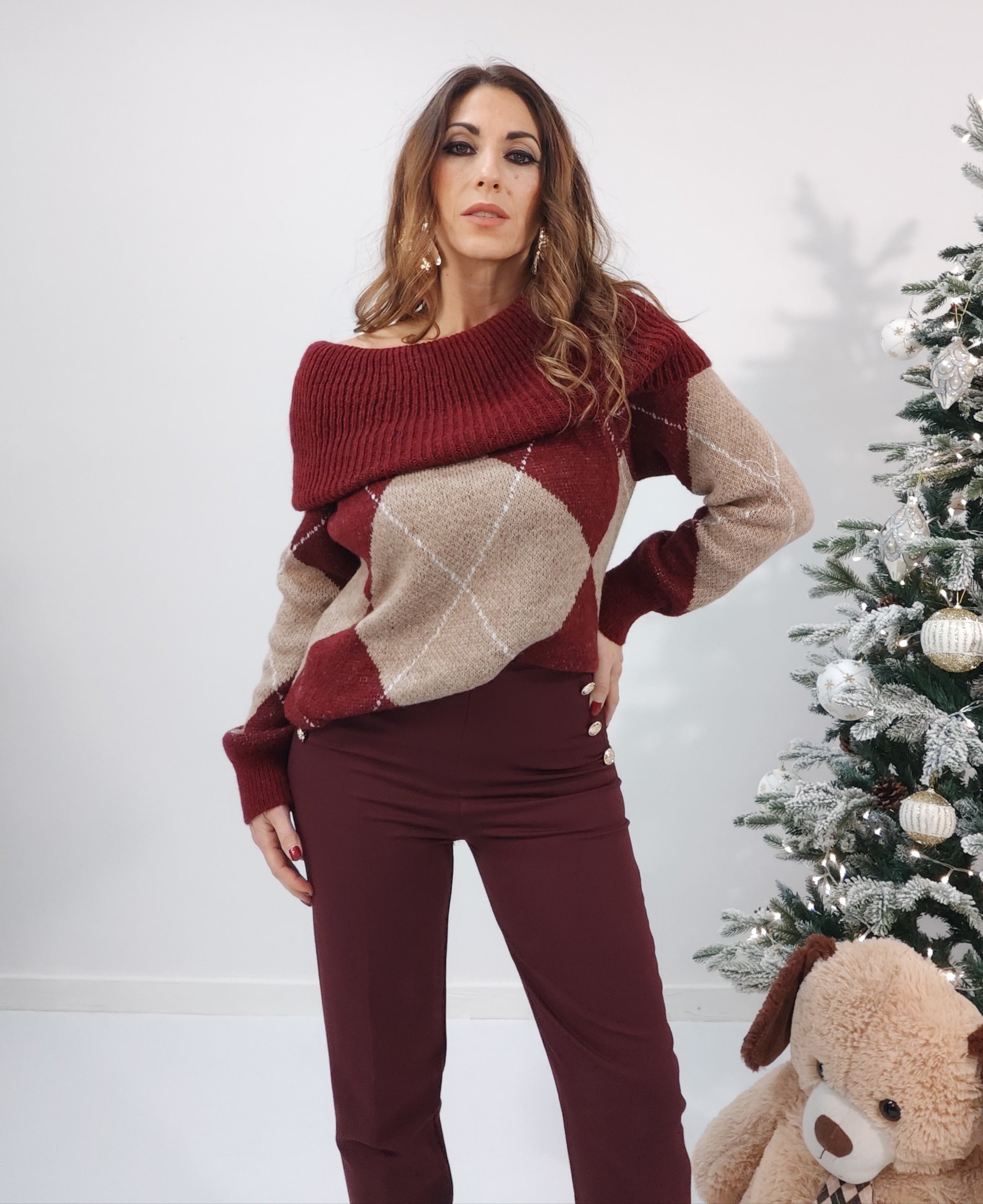 Maglione a rombi, caldo e avvolgente di colore bordeaux. Collo ampio. Può essere portato sceso su una spalla. Ideale sopra un leggins o con una minigonna o con il pantalone a sigaretta. Taglia unica.