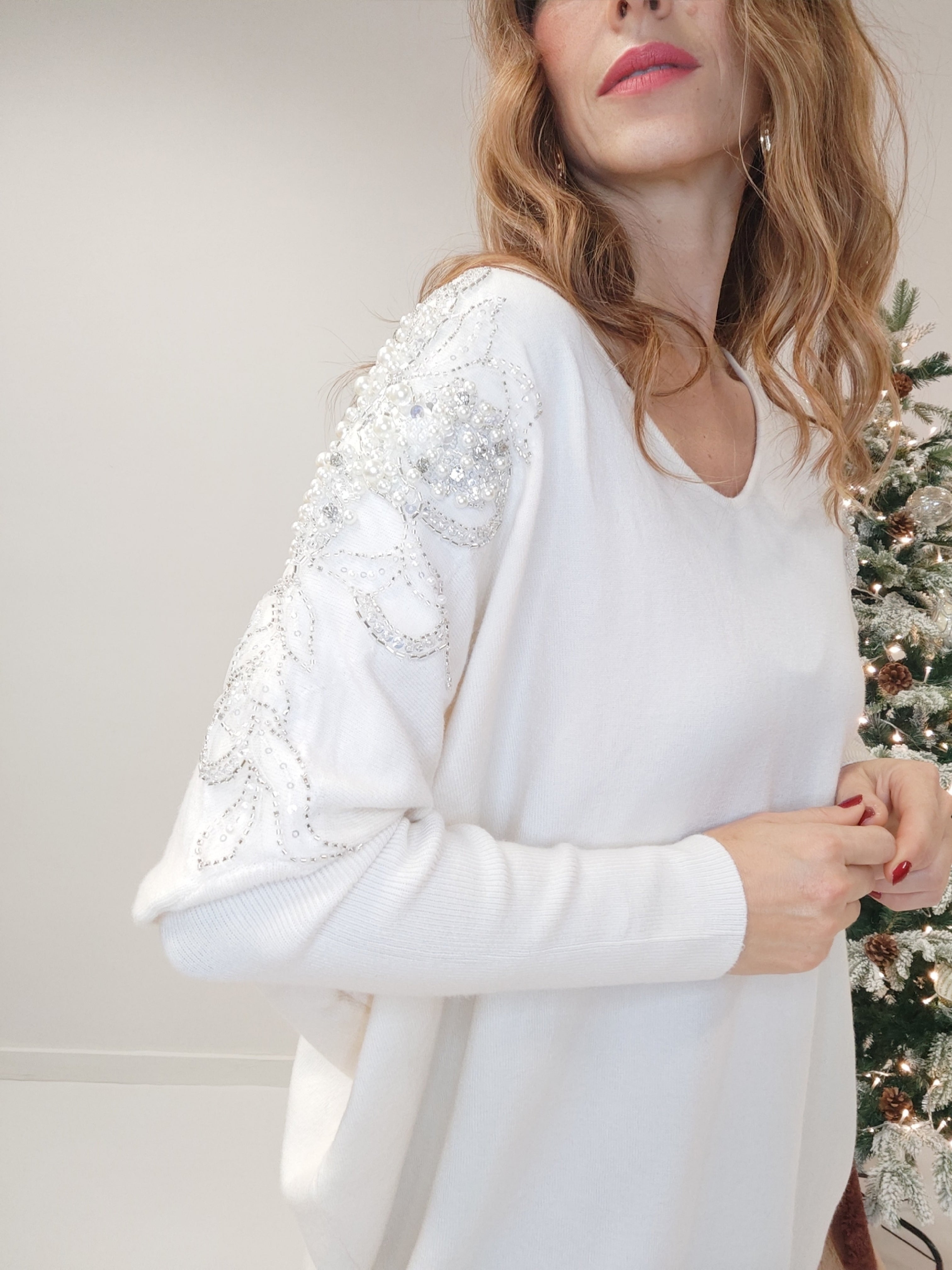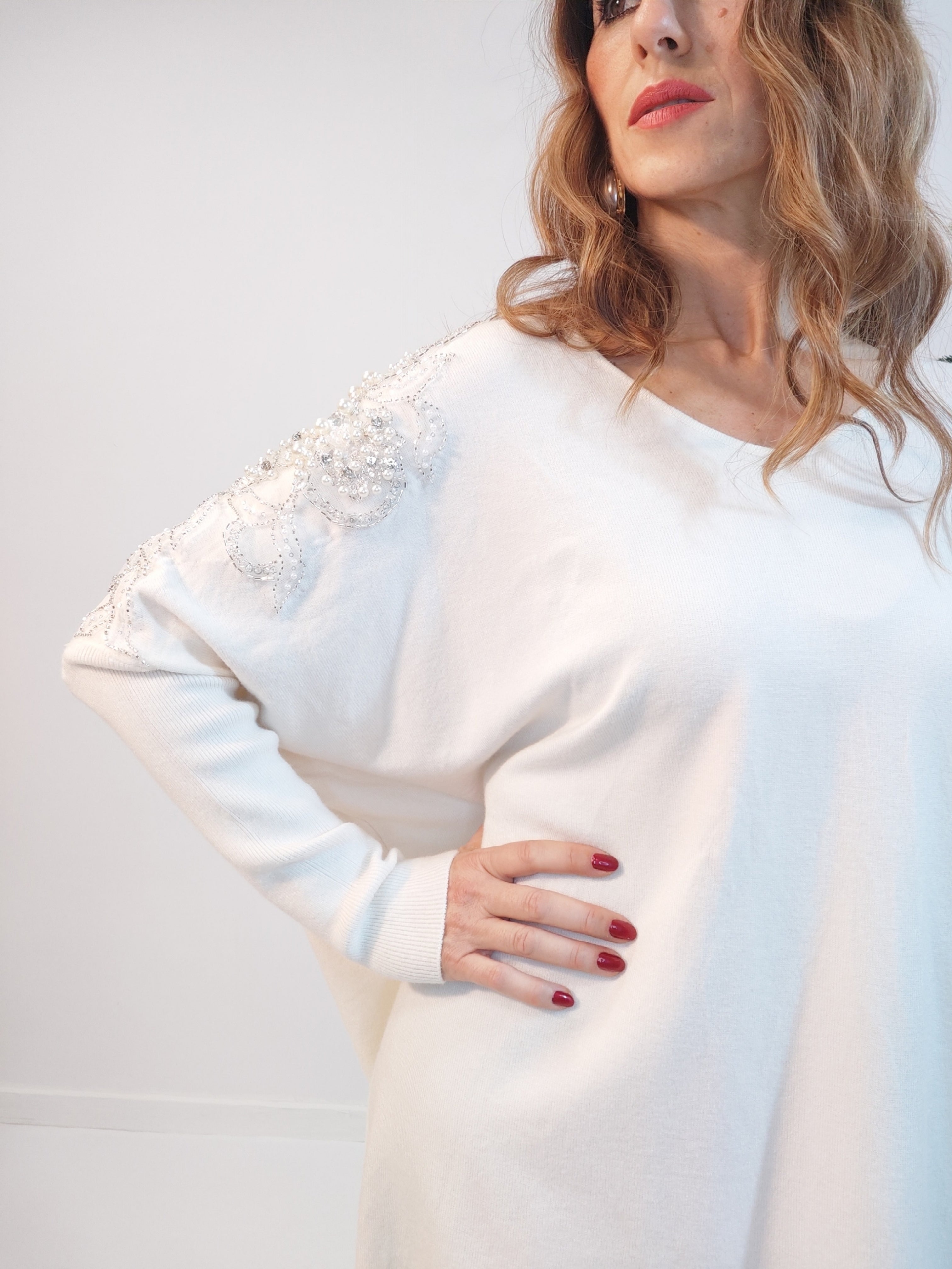 Bellissima e chic la maxi maglia impreziosita da perle e strass ricamati sulle spalle fino a scendere. Scollo a V. Taglia unica.